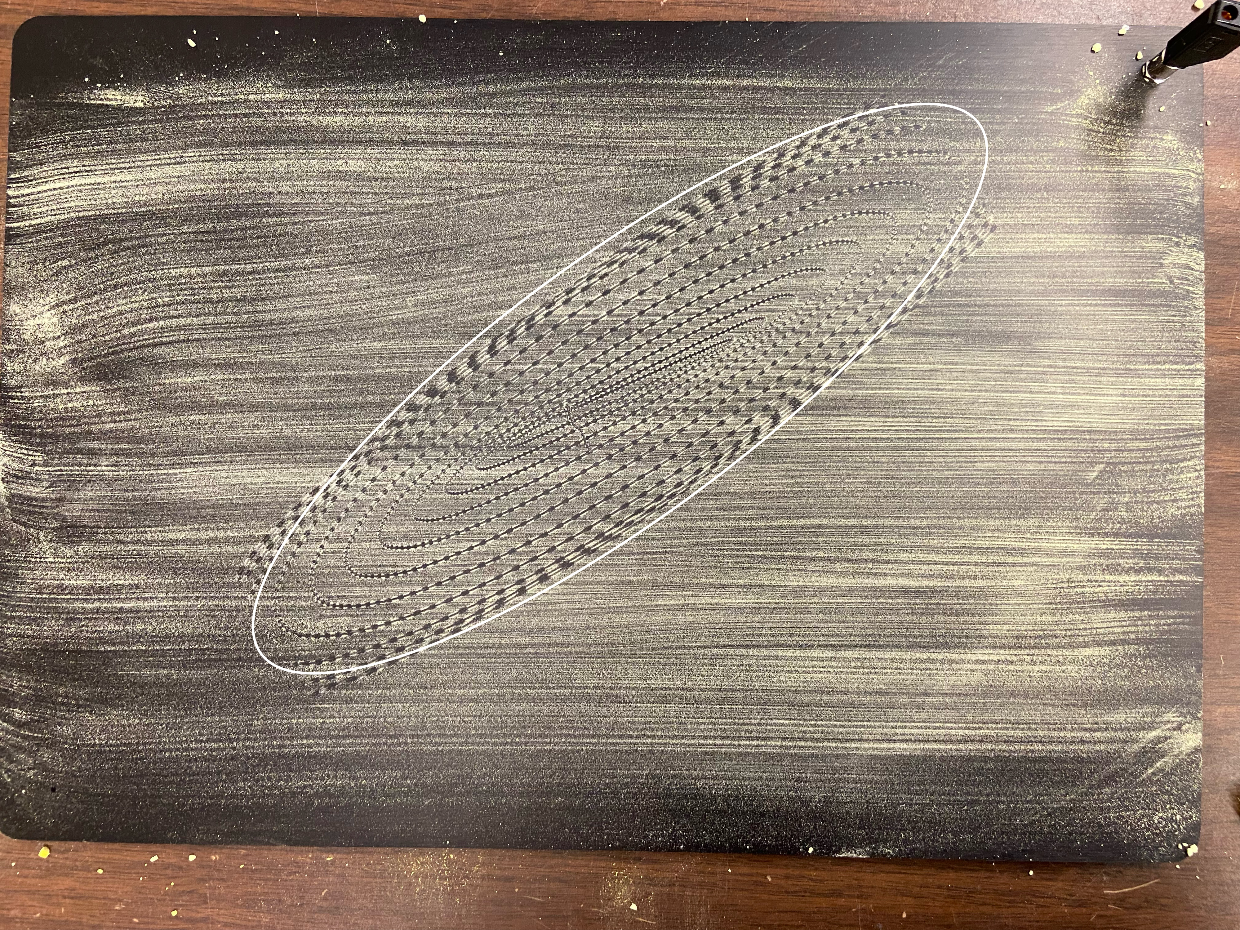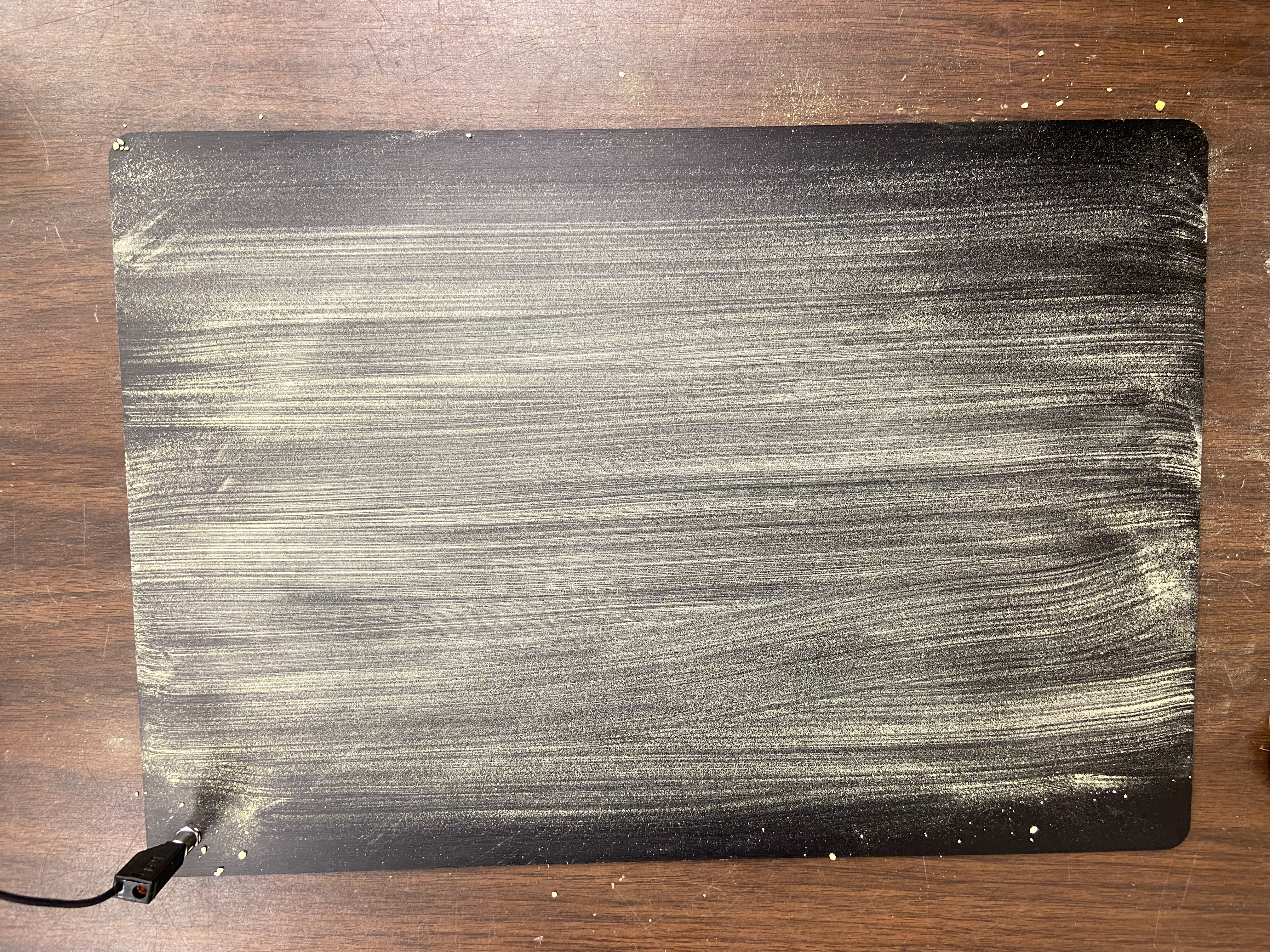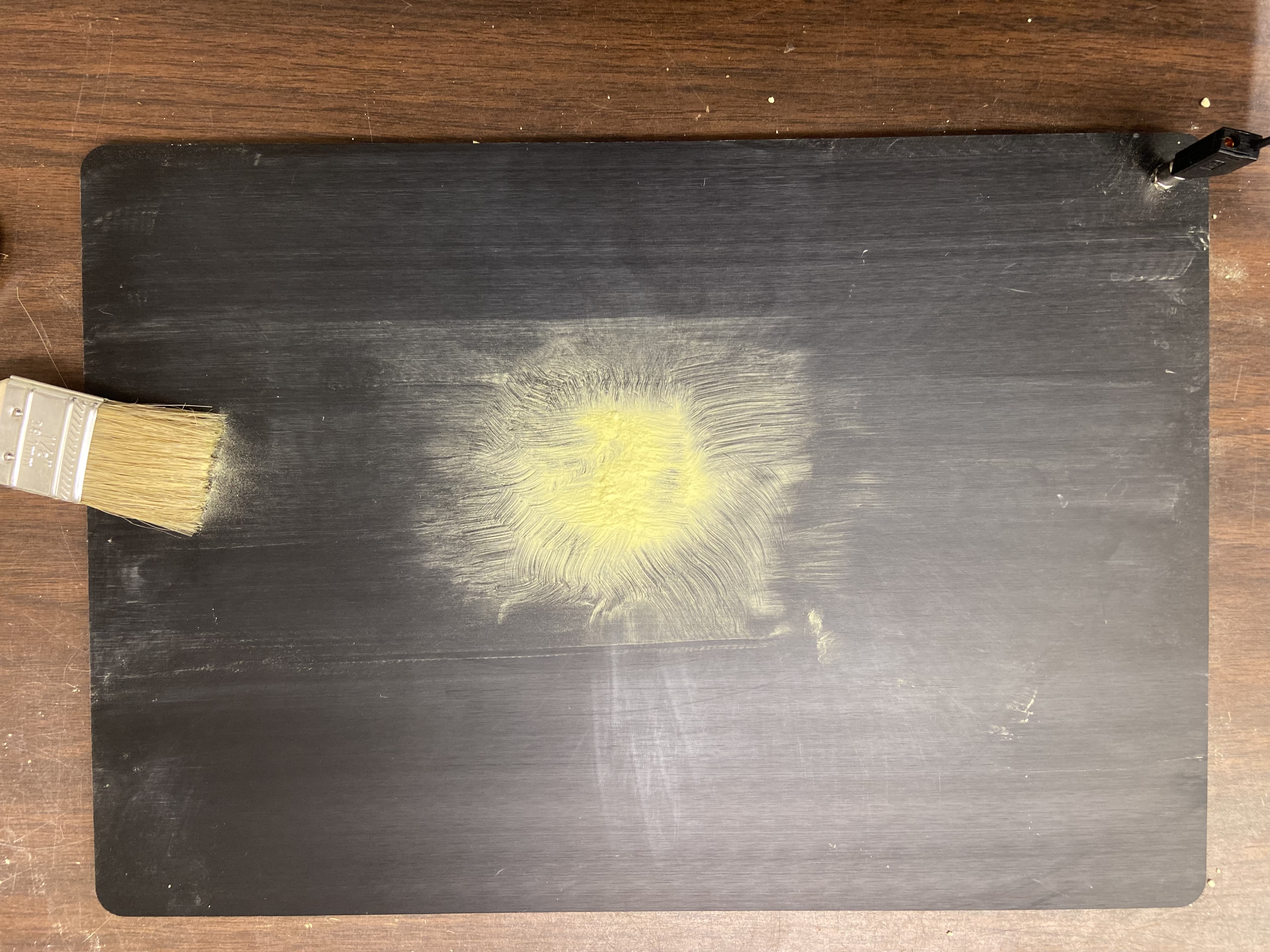 - Use the brush and spread the powder thinly onto the board. The board should look like the figure shown on the right below.