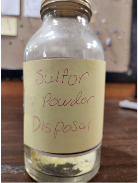 - Once the demo is returned, pour the remaining sulfur powder into the glass container labelled for sulfur powder disposal as best as you can (pictured below).