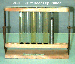 - Six viscosity test tubes are filled with various liquids and have a metal ball inside.