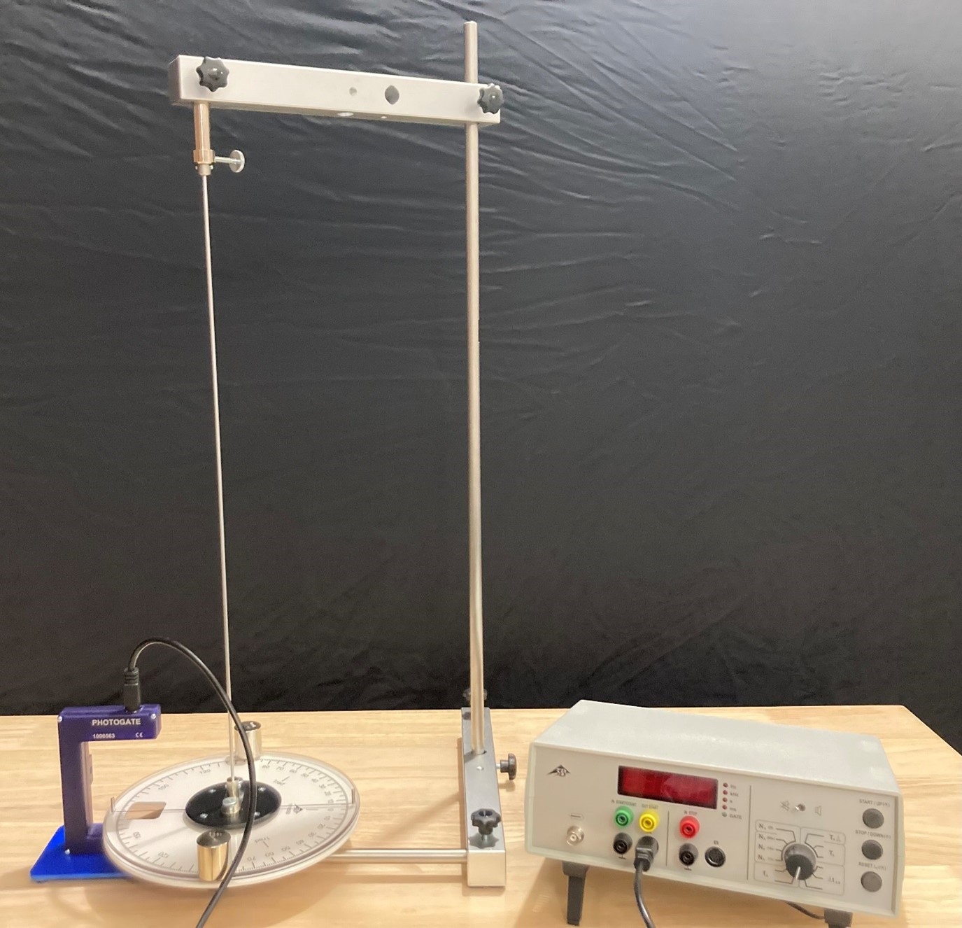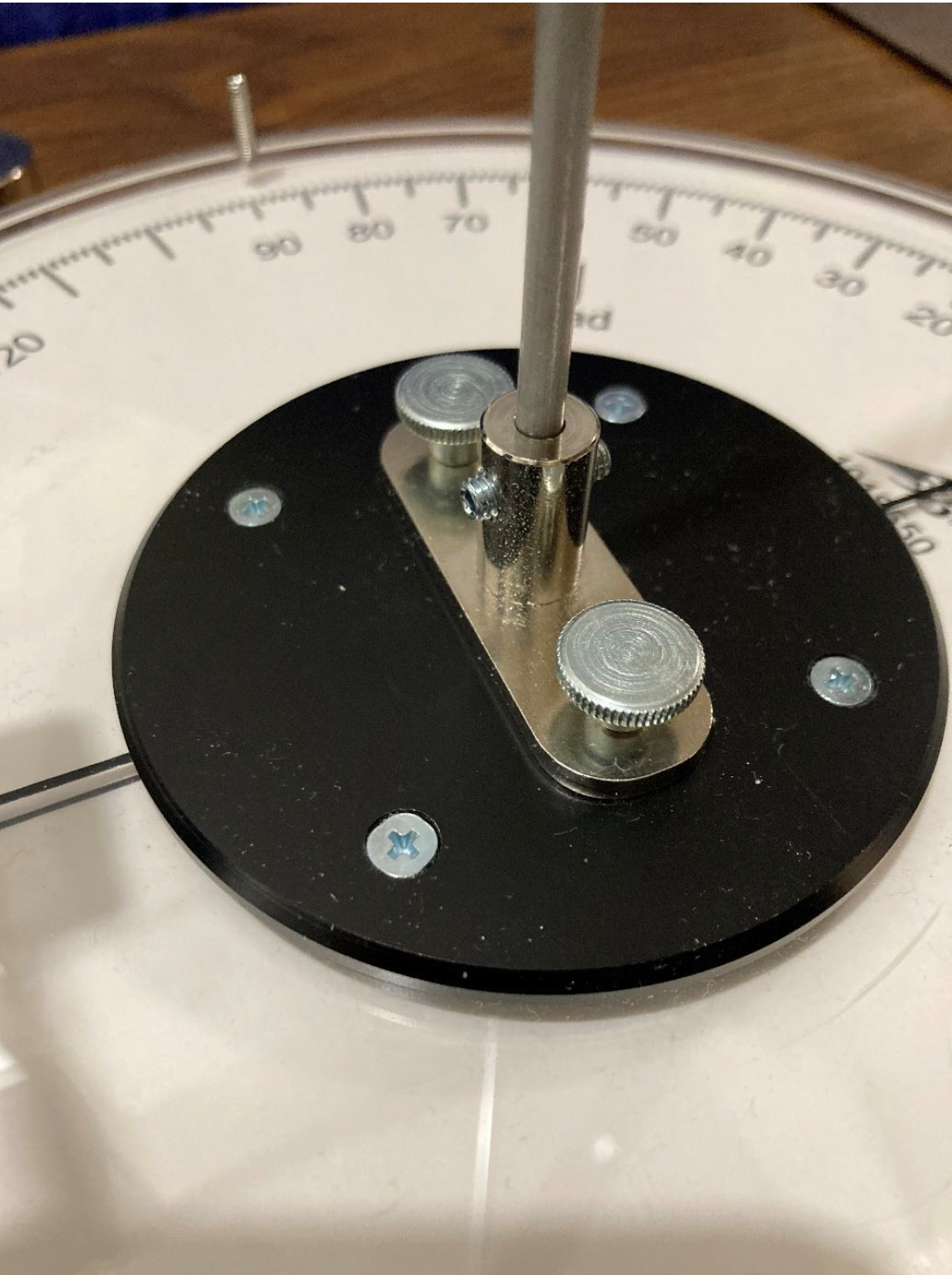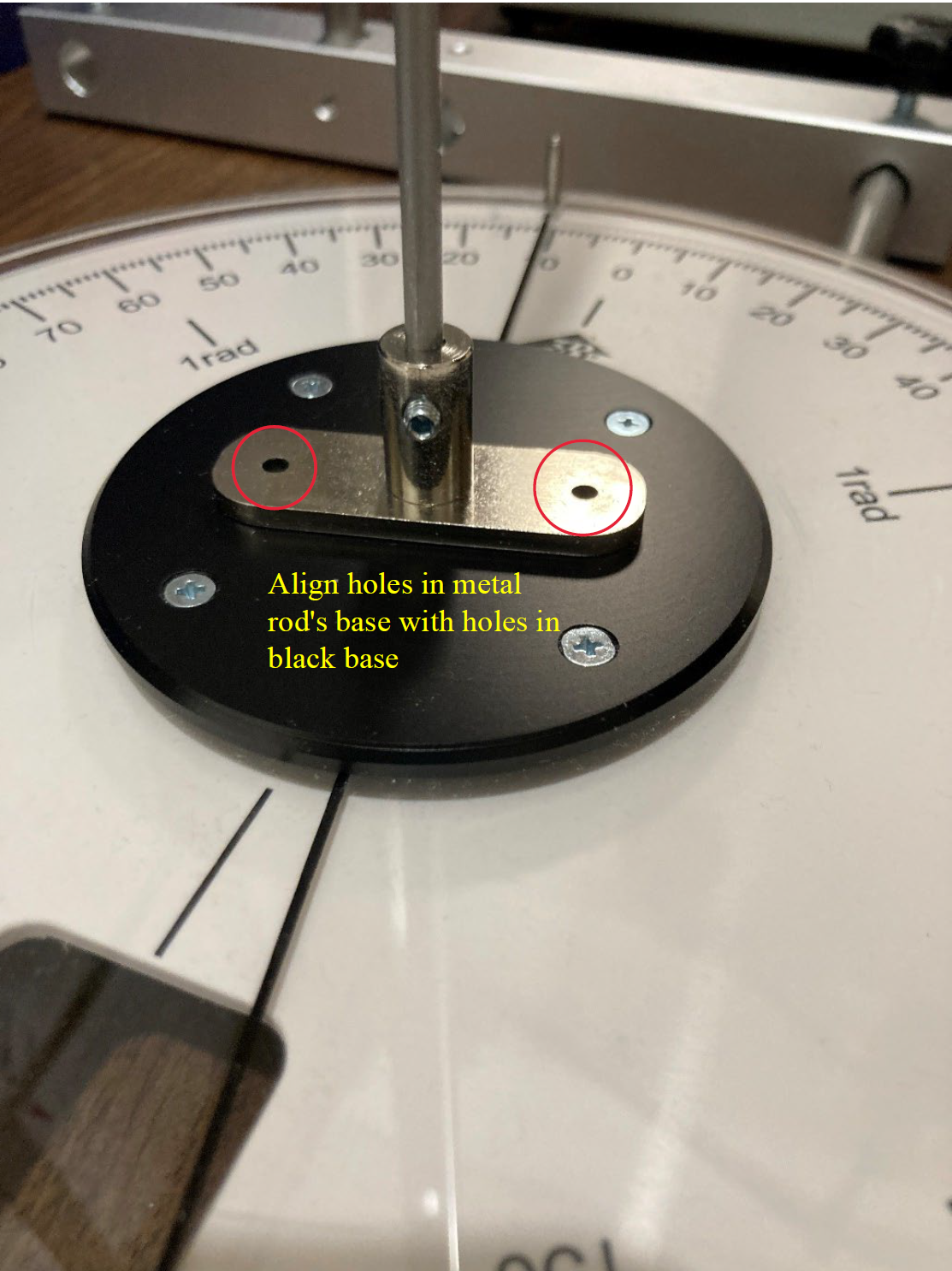 Beneath the base, there is a circular protractor that measures the angular displacement of the torsion pendulum. Align the black line that goes through the diameter of the protractor such