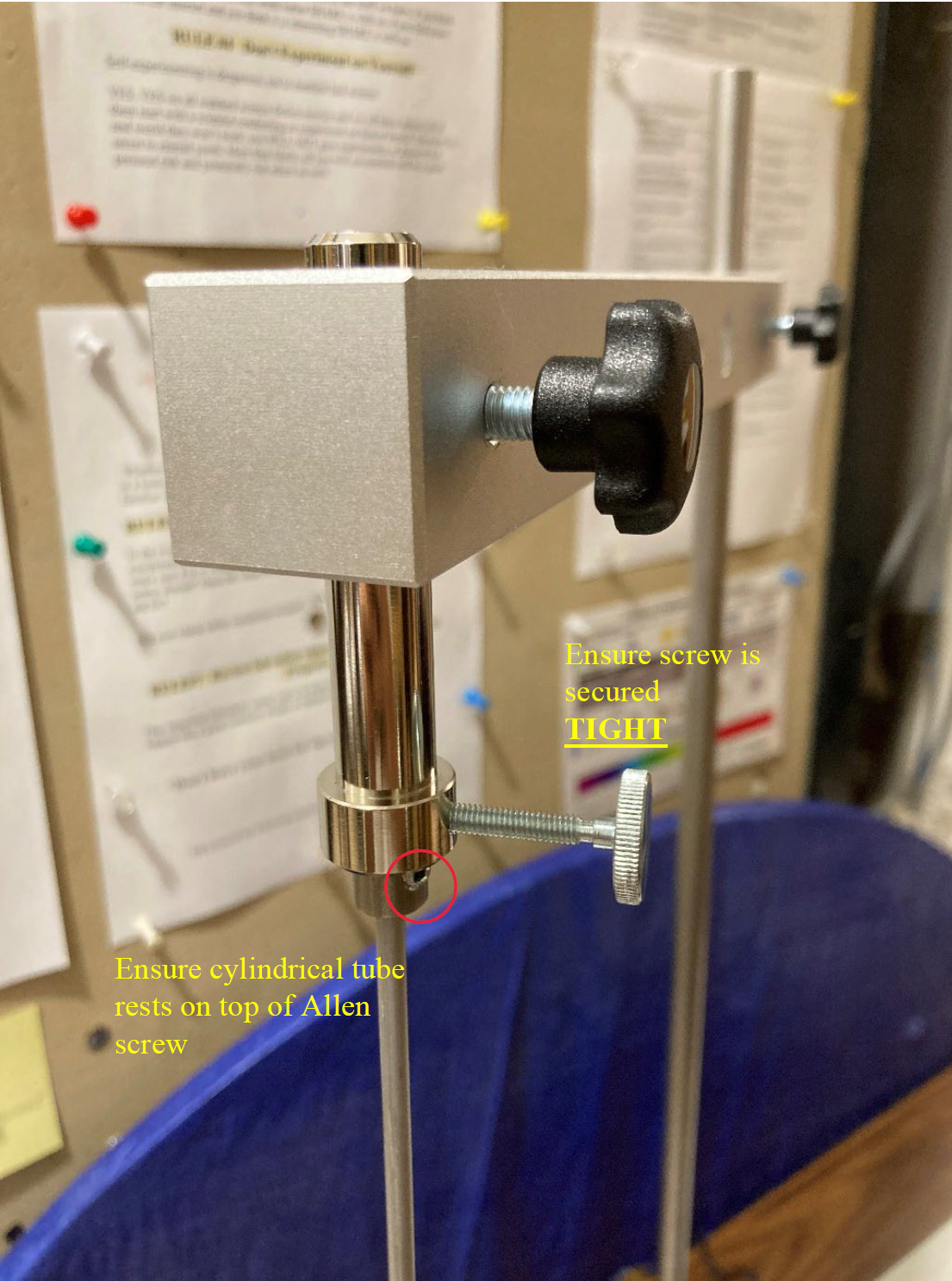 There is a cylindrical metal tube at the end of the vertical bar. This will be used to hold the head of the beam in place. By loosening the black screw that is holding the cylindrical tube in place, allow it to slide down on top of the top of the beam. It should be resting on top of the Allen screw at the head of the beam.