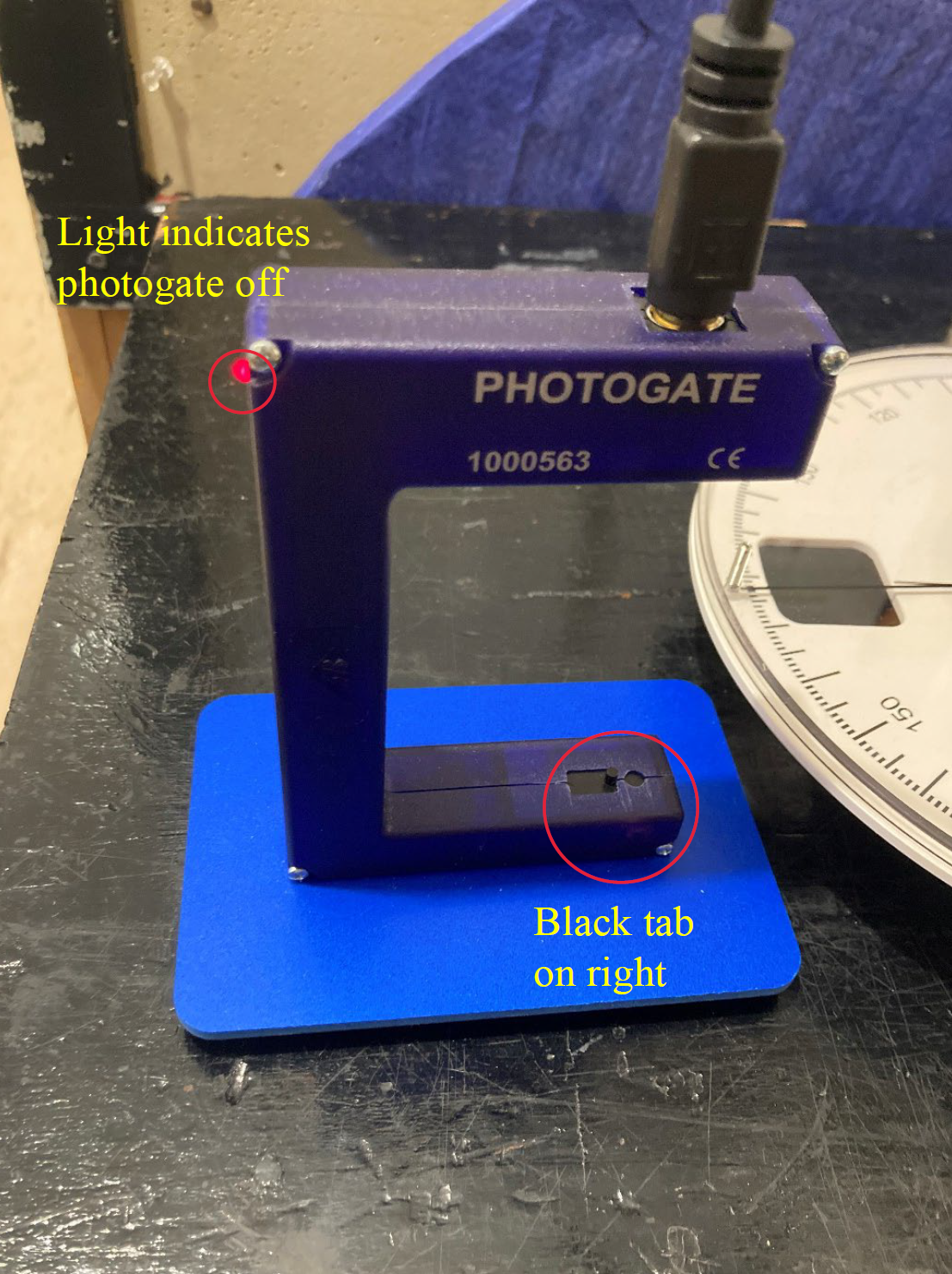 Ensure that the photogate is on. The red light on the side of the photogate will be on if it is off. To turn it on, there is a black tab at the bottom of the photogate from which the laser will emerge. Slide the black tab to the left. The red light on the side of the photogate should now be off. See Fig. 5 and Fig. 6 for reference