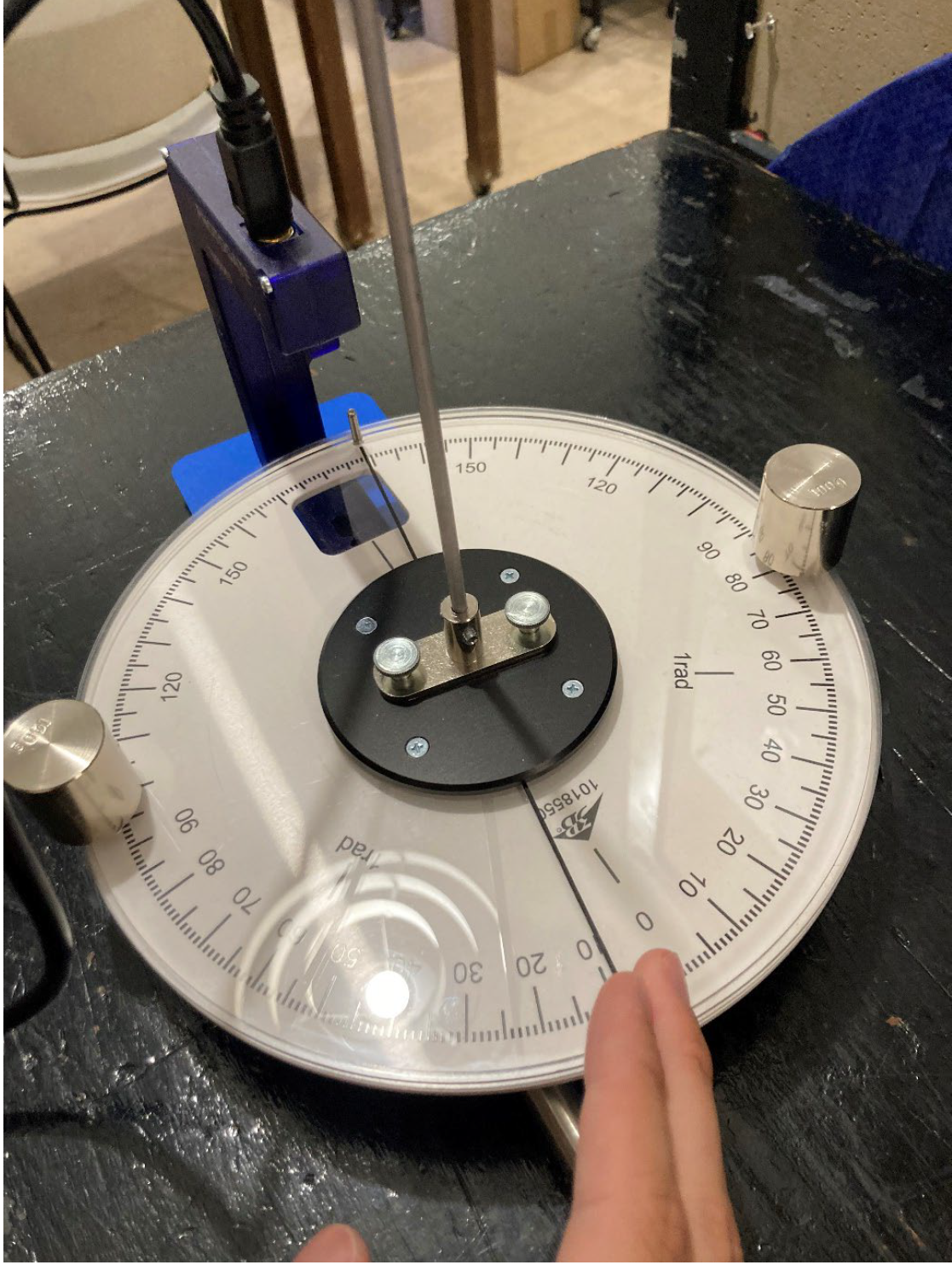On the glass platform above the circular protractor, there are metal tabs. Use these metal tabs to displace the torsional pendulum from its equilibrium position. Be careful not to rotate the base too much so that the base is shifted from its position, as this will affect the oscillations detected by the photogate.