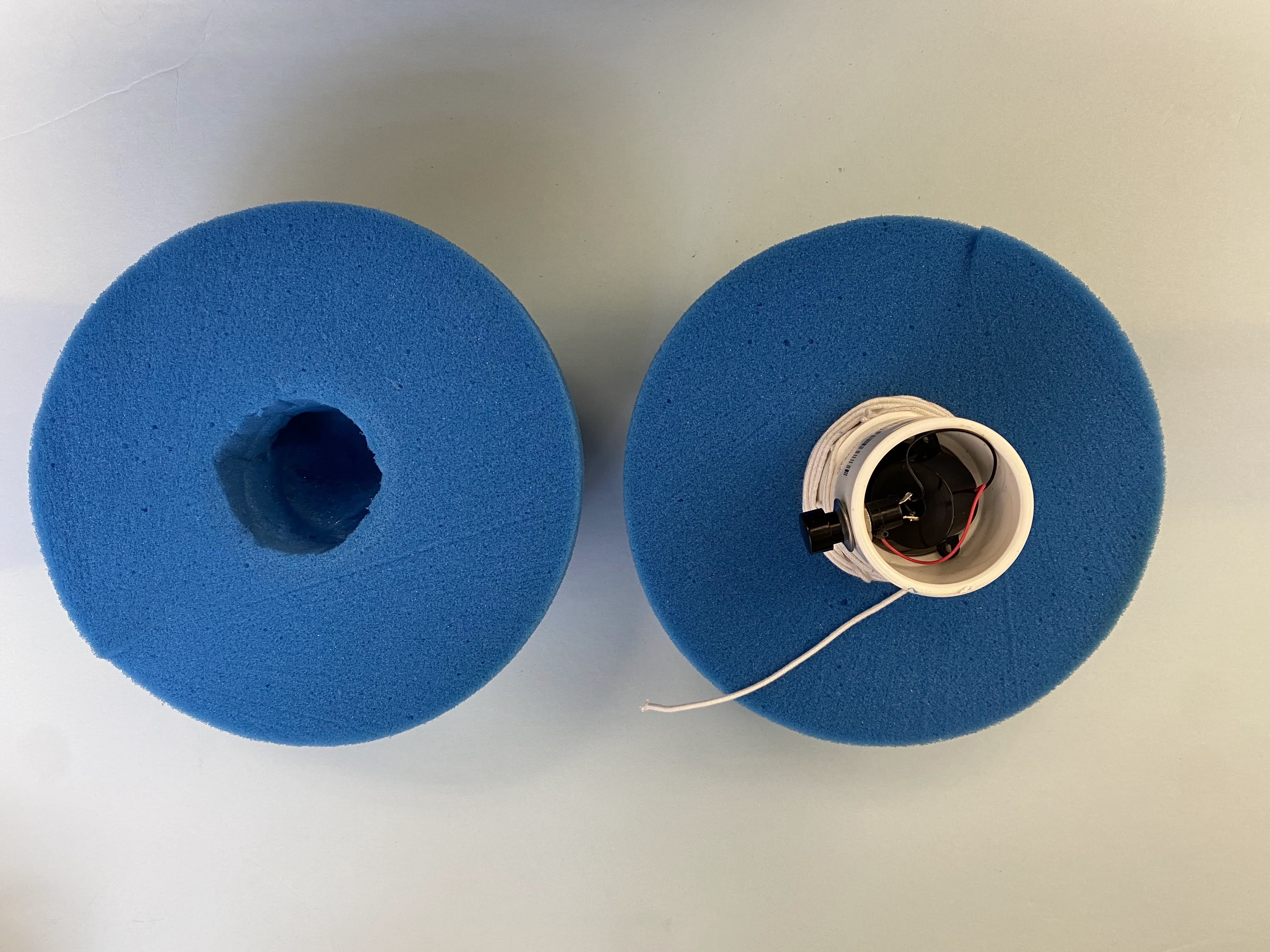 approximately 620 Hz. The circuit and speaker are housed in skinned foam that protects the unit