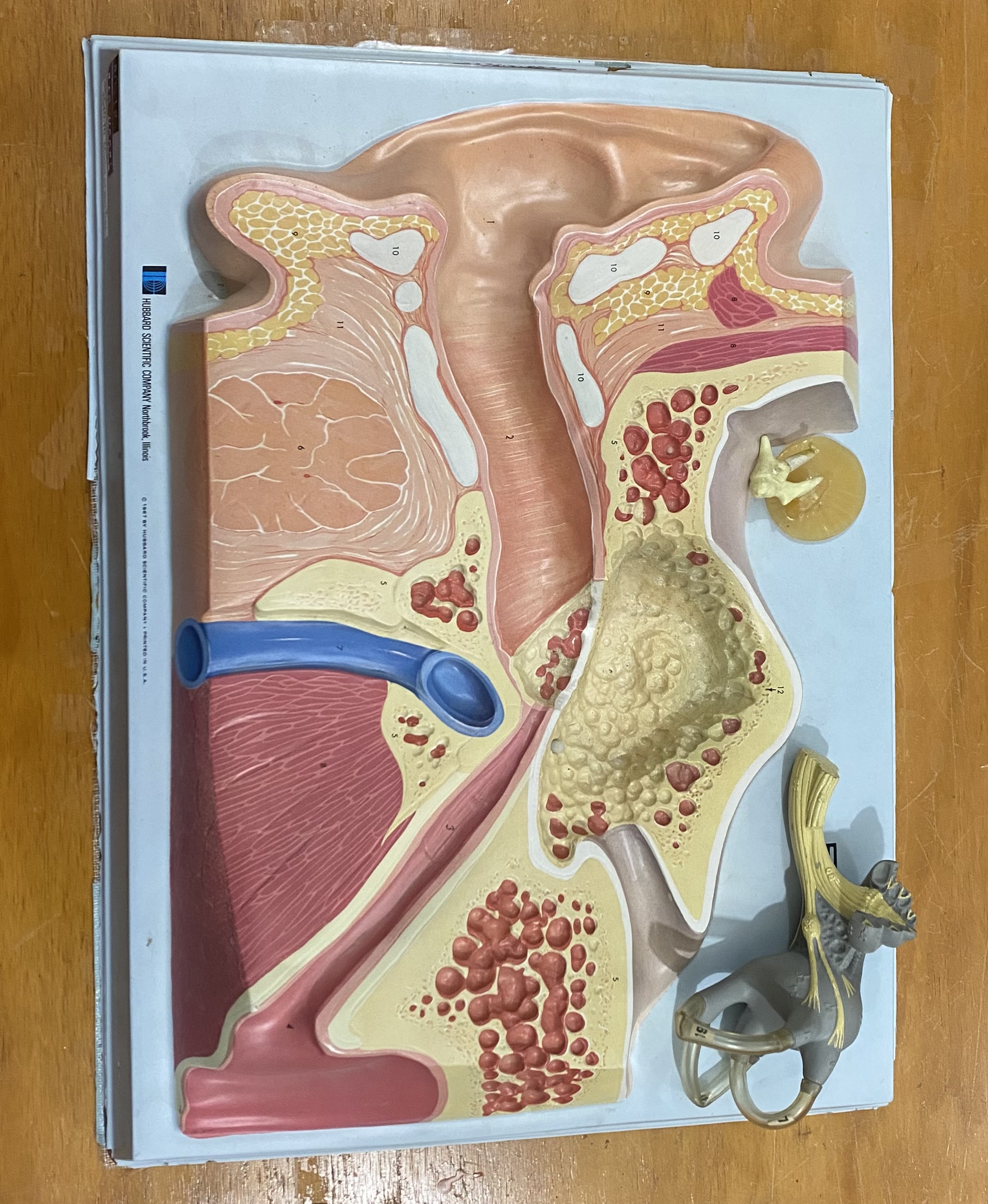 - The two unattached pieces include the cochlea with semicircular canals and the ear drum with three bones of the middle ear (incus, stapes, and malleus).
