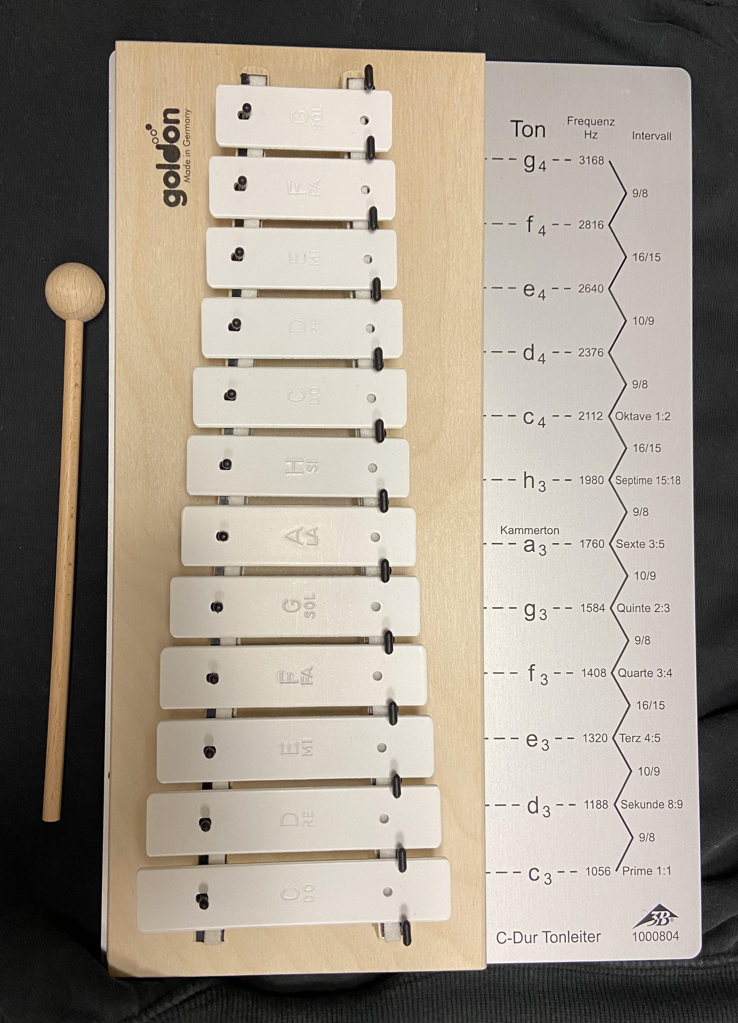 - Using the mallet, strike one of the metal bars. You will hear a specific frequency