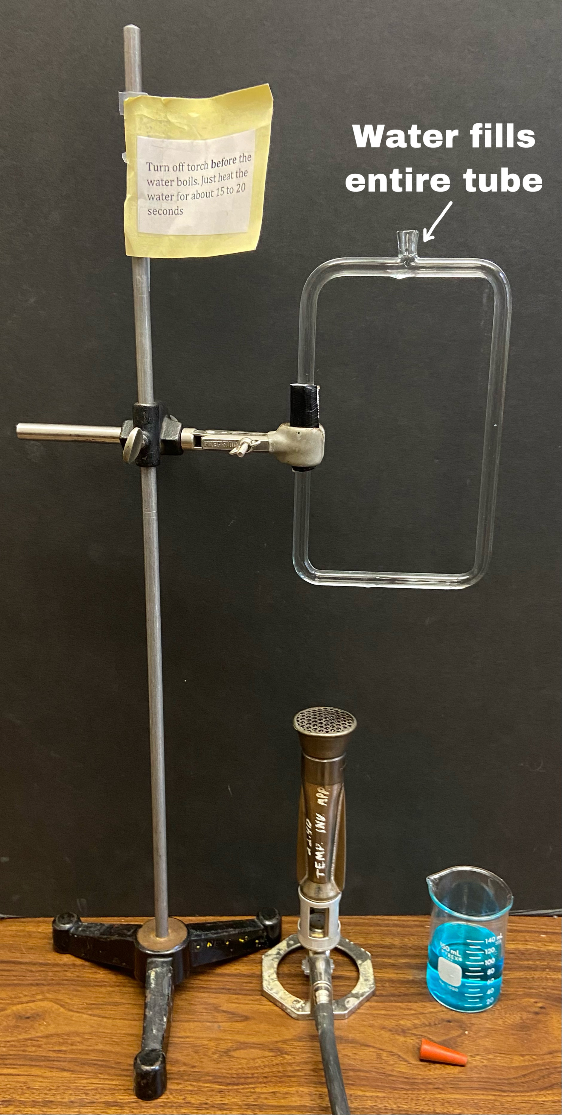 - Note: Do not place tube over bunsen without water! If you do on accident, let it cool down completely before adding water. It WILL crack if you don't.