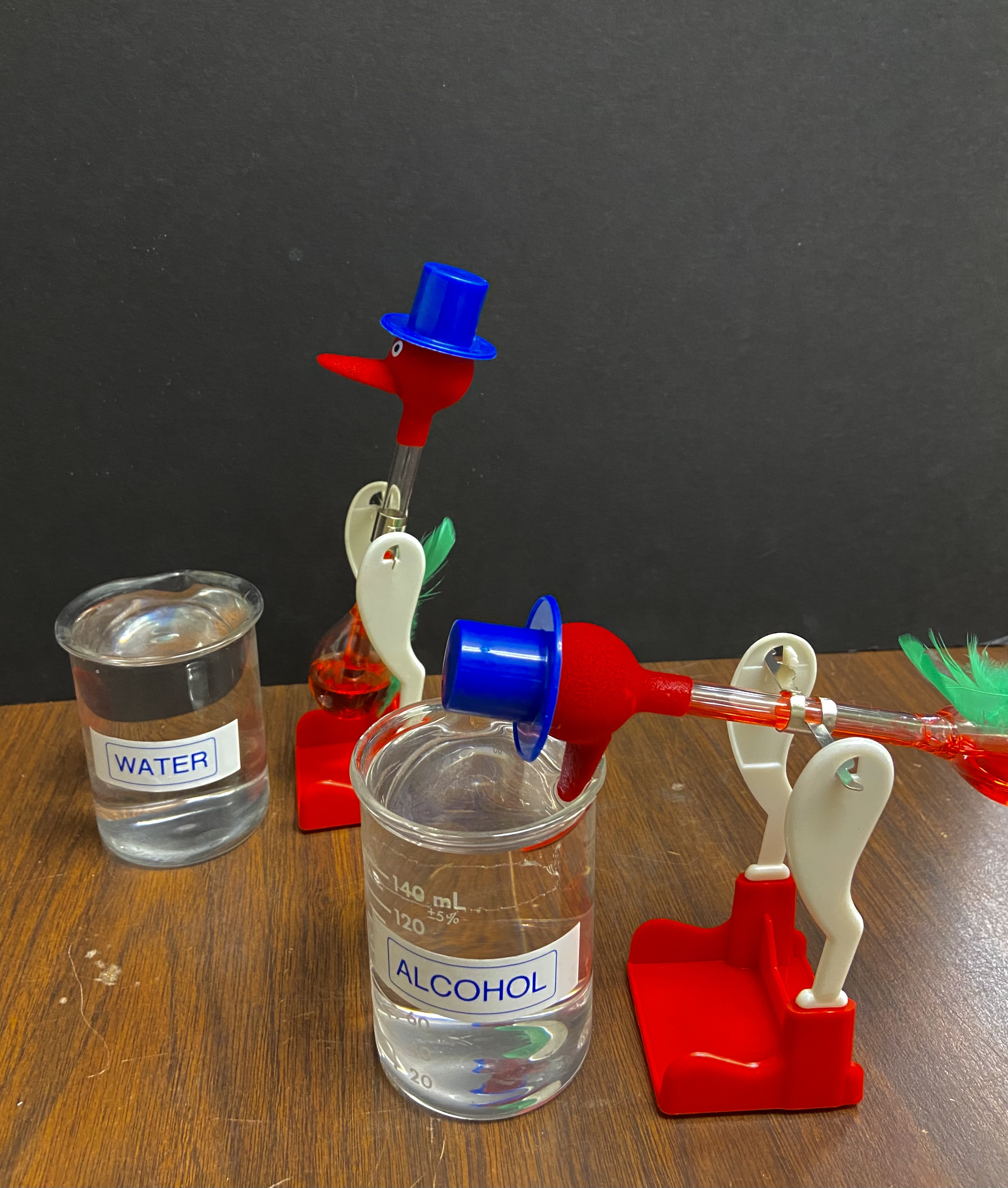 - Two drinking birds, one with a glass of alcohol and second with water, is the preferred presentation.