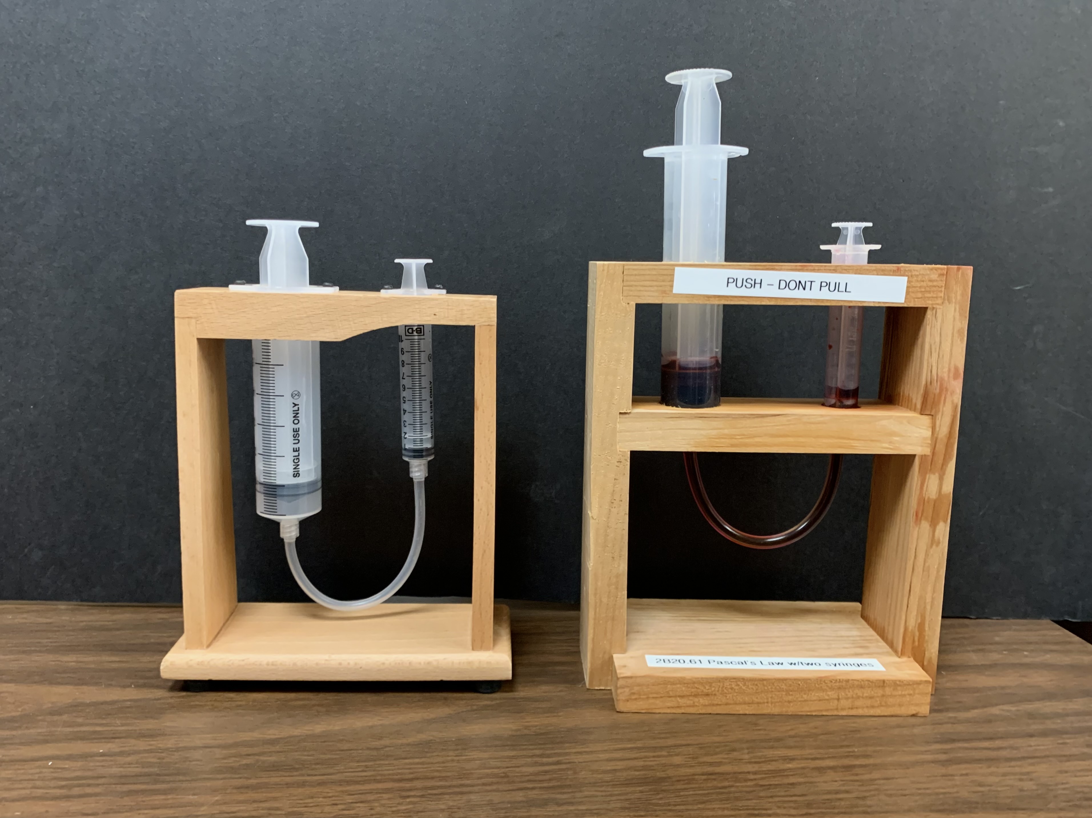 - Conjoined syringes: observe the initial volume measurement on the tubes, gently press down on the top of one of the syringe to decrease volume measurement, and observe the other syringe respond by rising.