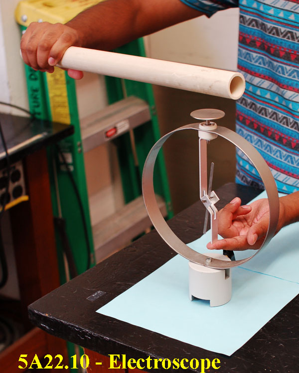 - Touch the top aluminum plate on the electroscope with a finger to discharge.