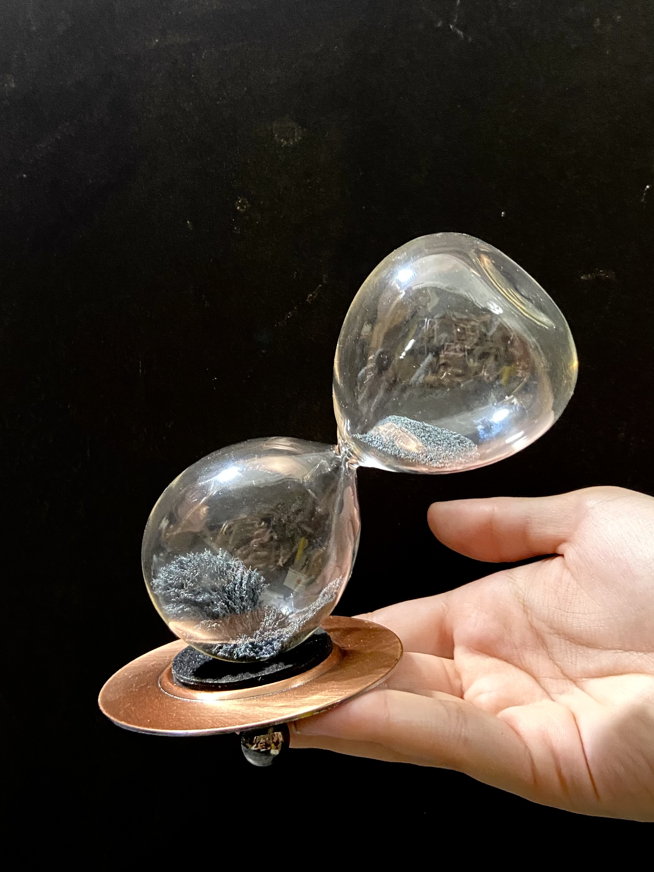 - Flip the hourglass onto the magnet provided and observe the arrangement of the iron filings inside.