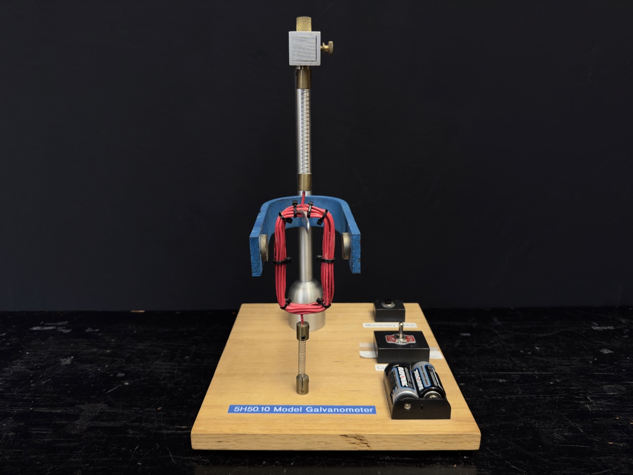 - A crude galvanometer with a large wire coil suspended between two magnetic poles.