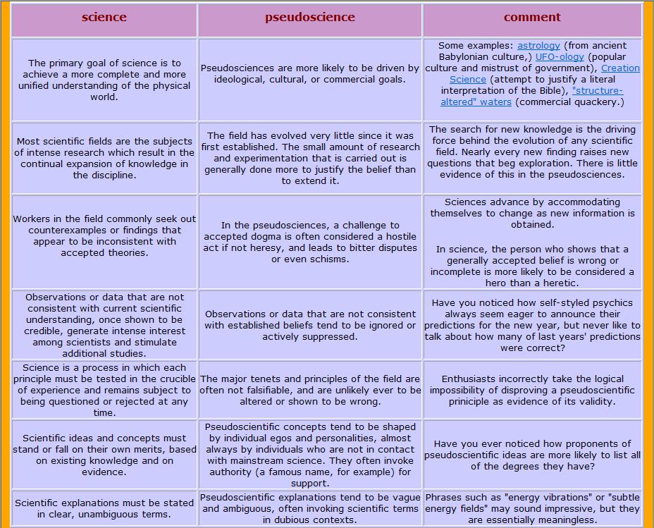 We have so far been discussing pseudoscience without making any direct comparison with science itself. However, it is informative to make a direct comparison, feature by feature—