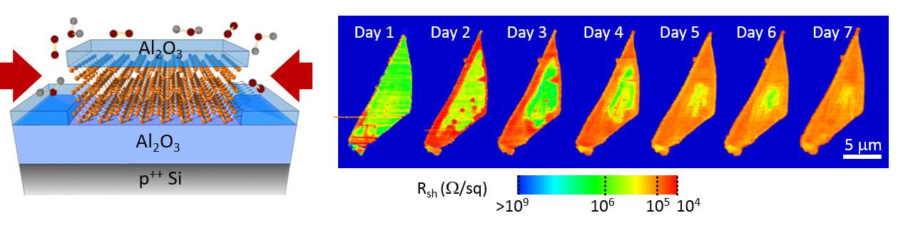 Our results reveal the degradation process of black phosphorus flakes capped by a thin layer of Al2O3. The chemical reaction with ambient moisture and oxygen starts from the poorly covered sample edges. The MIM-Re images, collected daily over one week, nicely demonstrate the edge-initiated conductivity changes.