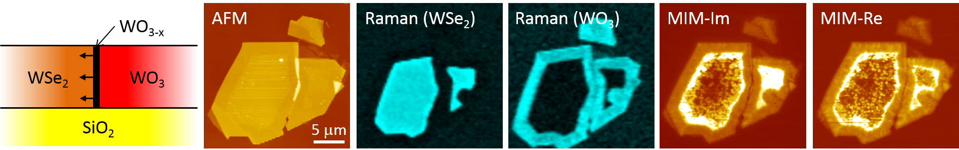 The lateral propagation of the thermal oxidation process in WSe2 is vividly shown in our experiment. In this partially oxidized WSe2 flake, the off-stoichiometric WO3-x is highly conductive, as evidenced by the strong MIM signals in the WO3-WSe2 interface.