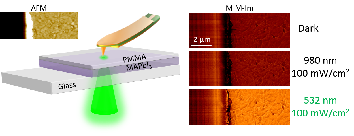 Schematic of the PMMA-coated perovskite MAPbI3 sample and the MIM setup with bottom illumination through the transparent glass substrate. The AFM image is shown on the top left corner. (Right) From top to bottom, MIM images of this sample in dark and under illumination. Clear photo response is seen when the solar cell material is illuminated by the above-gap 532-nm laser but not when illuminated by the below-gap 980-nm laser.