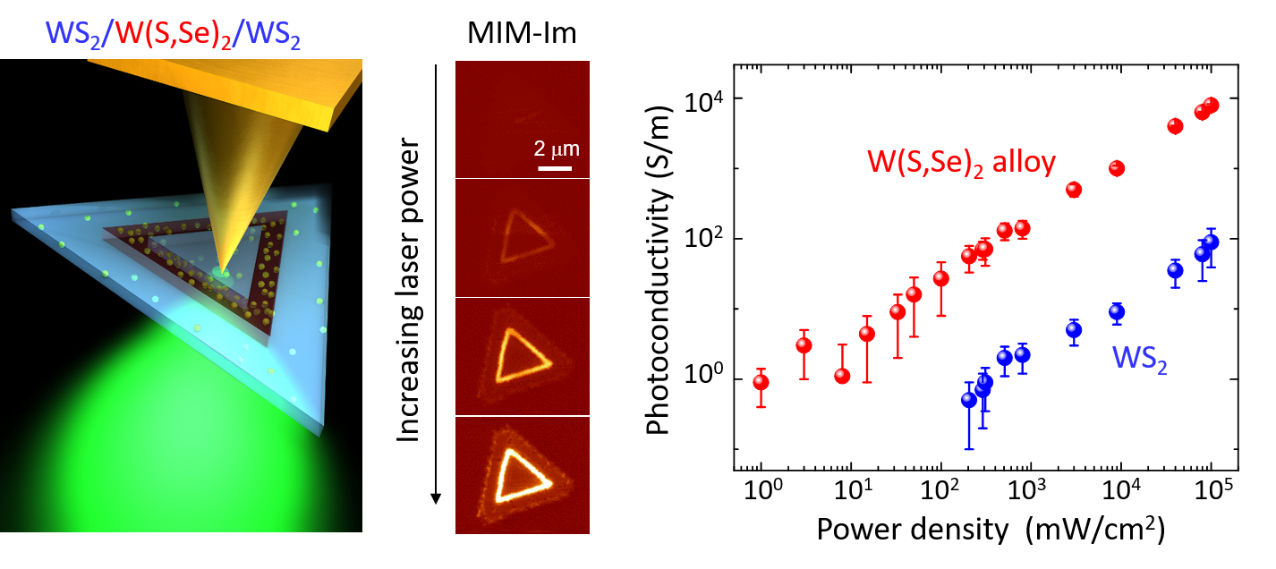 (Left) Artistic rendering of the laser stimulated MIM on the WS2/alloy/WS2 lateral hetero-junction sample. (Middle) Top-down: MIM-Im images as the laser intensity increases. (Right) Photoconductivity as a function of the illumination power. The local photoconductivity of the alloy region is enhanced by two orders of magnitude over WS2.