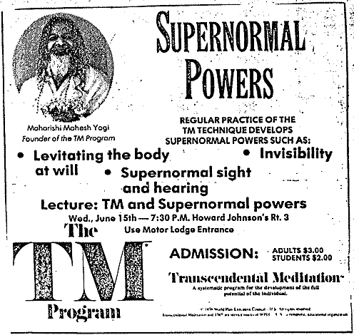 The partitions between pseudoscience and religion are tissue-thin, and it is not unusual for a pseudoscience to evolve into a religion, or a religion to evolve into a pseudoscience. Science fiction writer L. Ron Hubbard in the late 1940s had a pseudoscientific parody of psychoanalysis, called Dianetics— graduates of the interminable Dianetics courses would become “clear,” and potentially superhuman. But in the early 1950s Hubbard reconfigured and expanded the pseudoscience as a science-fictional religion, Scientology. Graduates of the interminable Scientology courses would become Operating Thetans, with various godlike powers, and the ability to remember past lives going back 60 trillion years. A retrograde path was taken by the Spiritual Regeneration Movement, a traditional Vedic cult that evolved into Transcendental Meditation, which explicitly denies it is a religion, and offers interminable courses that promise you will someday be able to levitate and fly, walk through solid walls, become invisible, and develop pretty much all the same godlike powers promised by Scientology. Somehow nobody ever “graduates”— they just keep taking more courses, and the cash keeps flowing into the coffers of these two large and greedy groups.